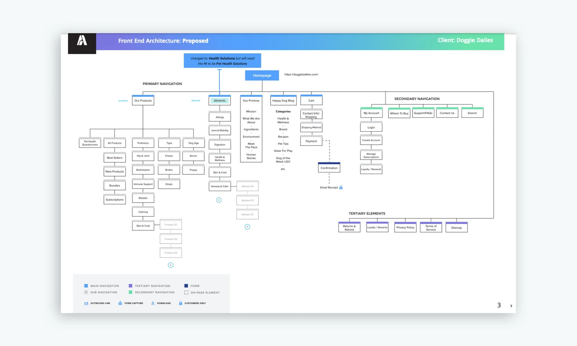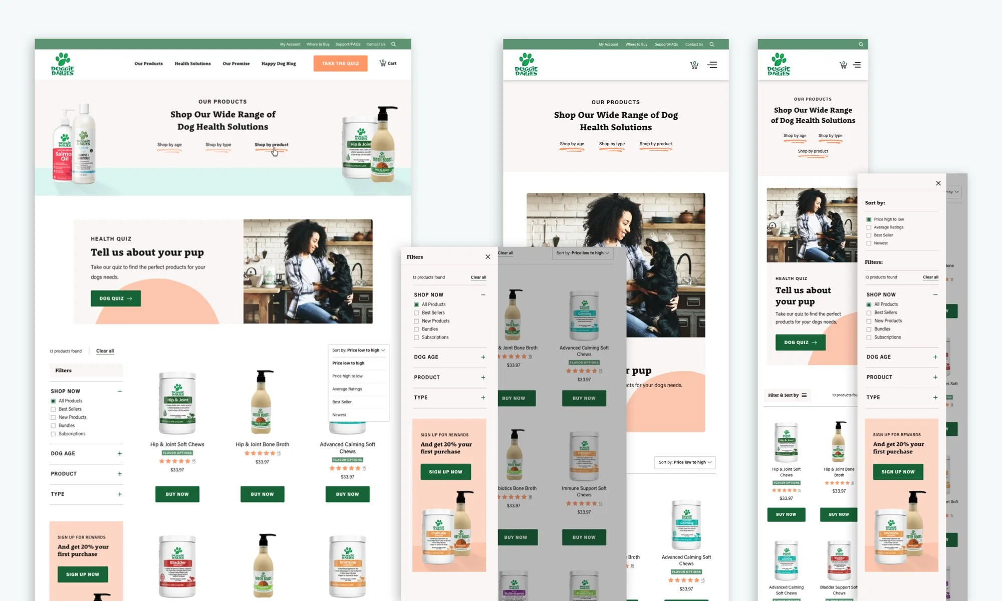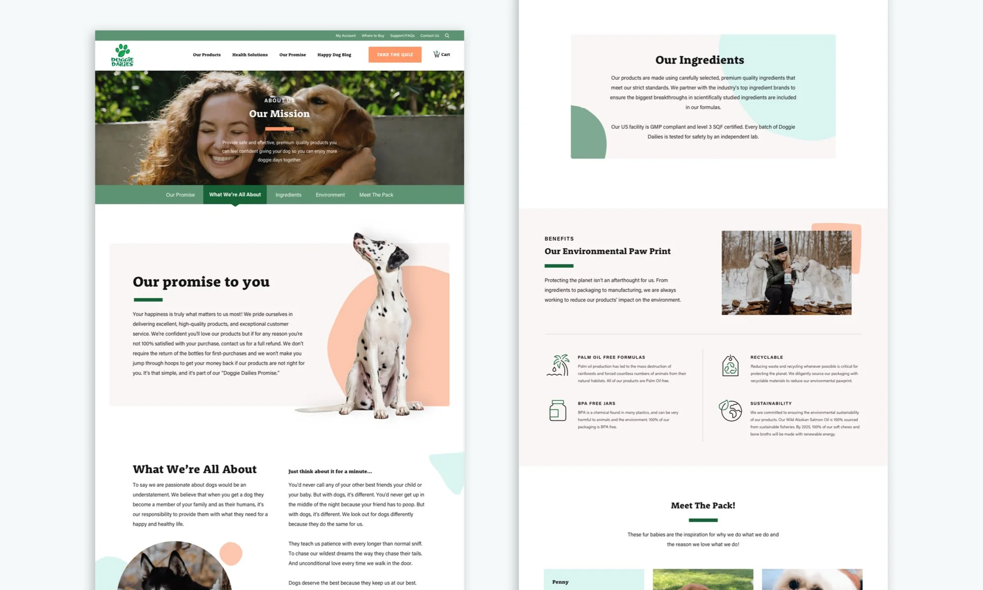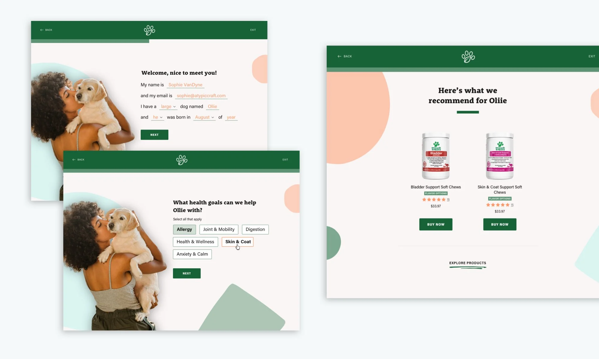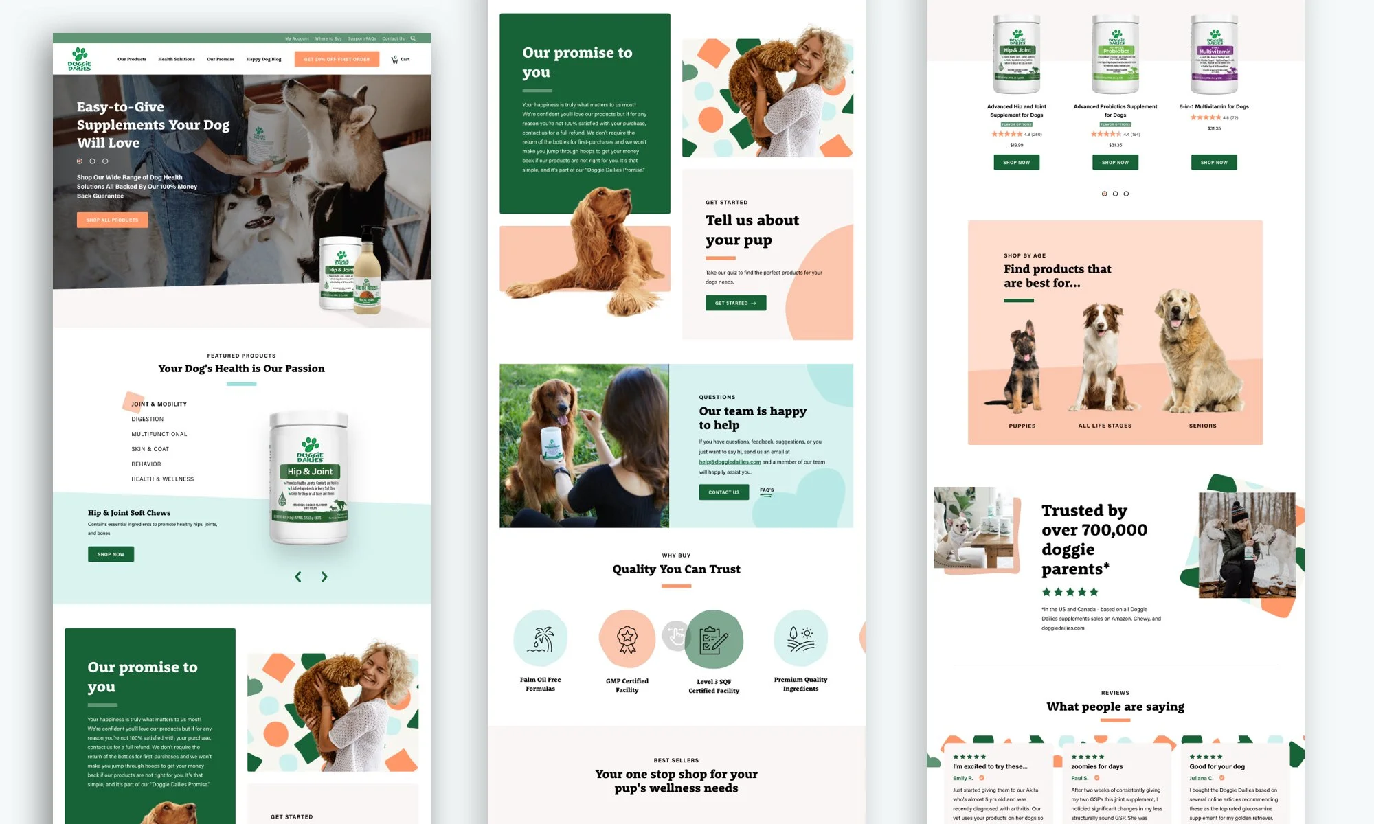Doggie Dailies has supplied over 700,000 dog owners with a variety of dog health solutions and supplements. My redesign focused on enhancing the customer’s online experience by pairing them with the right product based on their dog’s needs. The design utilizes playful pastels and soft filtering to help pet owners identify and select a product quickly and easily.